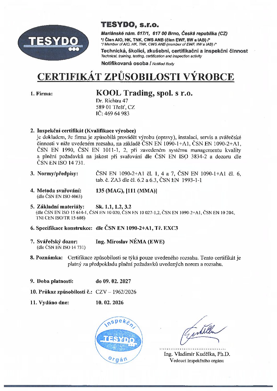 Quality certificate in welding according to standard ČSN EN ISO 3834-2:2006